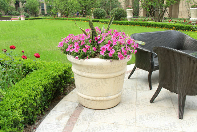 石材花缽的造型已經(jīng)打破了傳統(tǒng)的口大底小的倒圓臺或者倒棱臺形狀,造型奇特,不僅僅只是一個花缽,更是兼?zhèn)淞擞^賞藝術(shù)的功能。用一整塊石頭采用傳統(tǒng)工藝雕琢而成,其文化味也是十足的。加上花卉的點綴,便有一種孤芳自賞的美感自然流出。