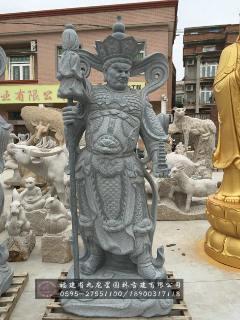 石雕四大天王采用優(yōu)等石材精雕細(xì)琢而成。整尊雕像身軀魁偉,氣勢(shì)威武,兩腿以半弓步橫跨在流云上,顯示出叱咤風(fēng)云,拔山蓋世的英雄氣概。