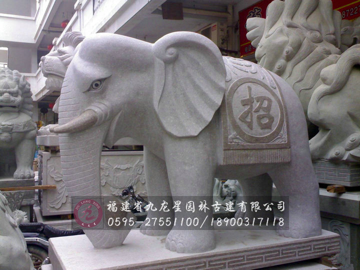 第一種是在雕塑石像時,在其腹部雕刻“招財進寶”字樣,每只大象各僅刻兩個漢字。雄性大象雕刻“招財”二字,雌性大象雕刻“進寶”兩個字。擺放遵循“左雄右雌”的原則,大象背對大門。這樣的話,來往的賓客就可以看到自身左側的為招財雄象,右側為進寶雌象雕塑,連起來即為招財進寶石雕大象。
