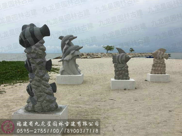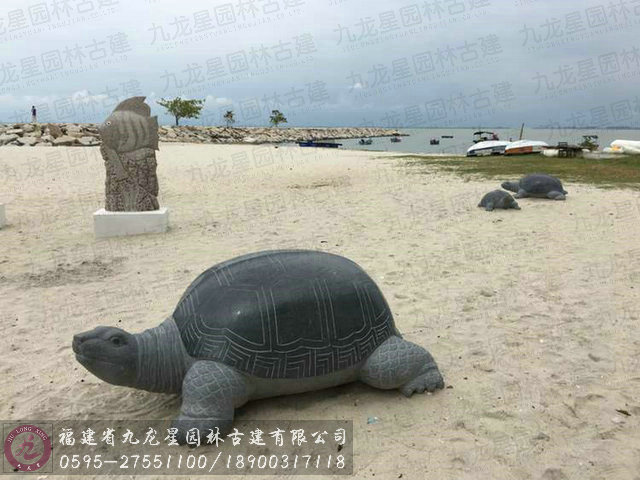 前年農(nóng)歷七月開始,海珠嶼大伯公廟這塊靠山臨海,占地10萬多方尺之地,經(jīng)過短短一年的人工美化,廟旁沙灘栽種一排排駿馬、靈鹿、孔雀、鳳凰等飛禽走獸的造型盆景,游客穿梭在植物走道弄潮看夕陽。沙灘上豎立起海龍王、蝦兵蟹將及石龜?shù)仁裥Σ[瞇與游客合照。來自中國惠安九龍星園林古建陳沂泉先生承包并制作該石雕工程項目。
