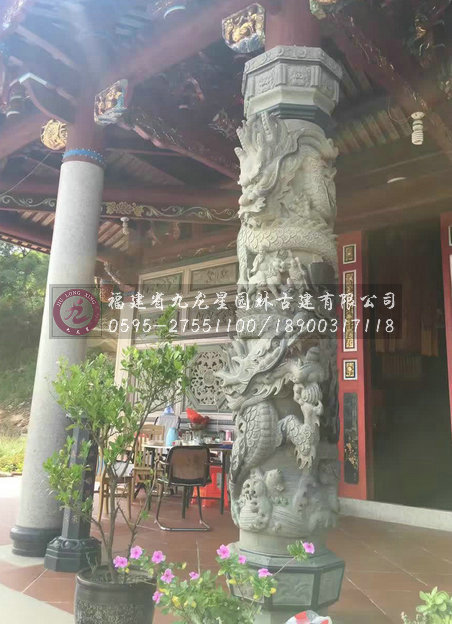 青石龍柱自清代以后大量出現(xiàn),因青石“韌”,宜精雕細刻。若按鏤雕深淺計算,具體可分為蟠龍柱、人物柱、花幕柱、八仙柱等;龍柱則又有淺浮雕與高浮雕之別,“白龍”柱基本是淺浮雕,而“青龍”基本是透析度極高的高浮雕。在龍的數(shù)量上區(qū)分,有單龍的盤繞柱,雙龍戲珠的柱子。而最為別致的是,“福龍”系列中聚成了閩南石雕龍柱的靈魂、寄托閩南人民的希望的“翻天覆地龍柱”。此外,可以按石柱本身的形狀分為方柱、八棱柱、六棱柱等等。