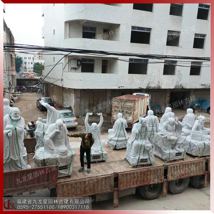 石雕十八羅漢雕塑一般采用天然石材加工制作而成,有花崗巖(芝麻白、芝麻黑、芝麻灰、蝦紅)、青石等,還有的則會用漢白玉石材制作。用于室外擺放石雕十八羅漢像通常建議用花崗巖石材雕刻,按順序擺放在兩側。